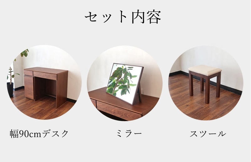 | サイズ | デスク:幅90cm×奥行き45cm×高さ71cm スツール:幅37cm×奥行き30cm×高さ42cm ミラー:幅55cm×奥行14cm高さ40cm |