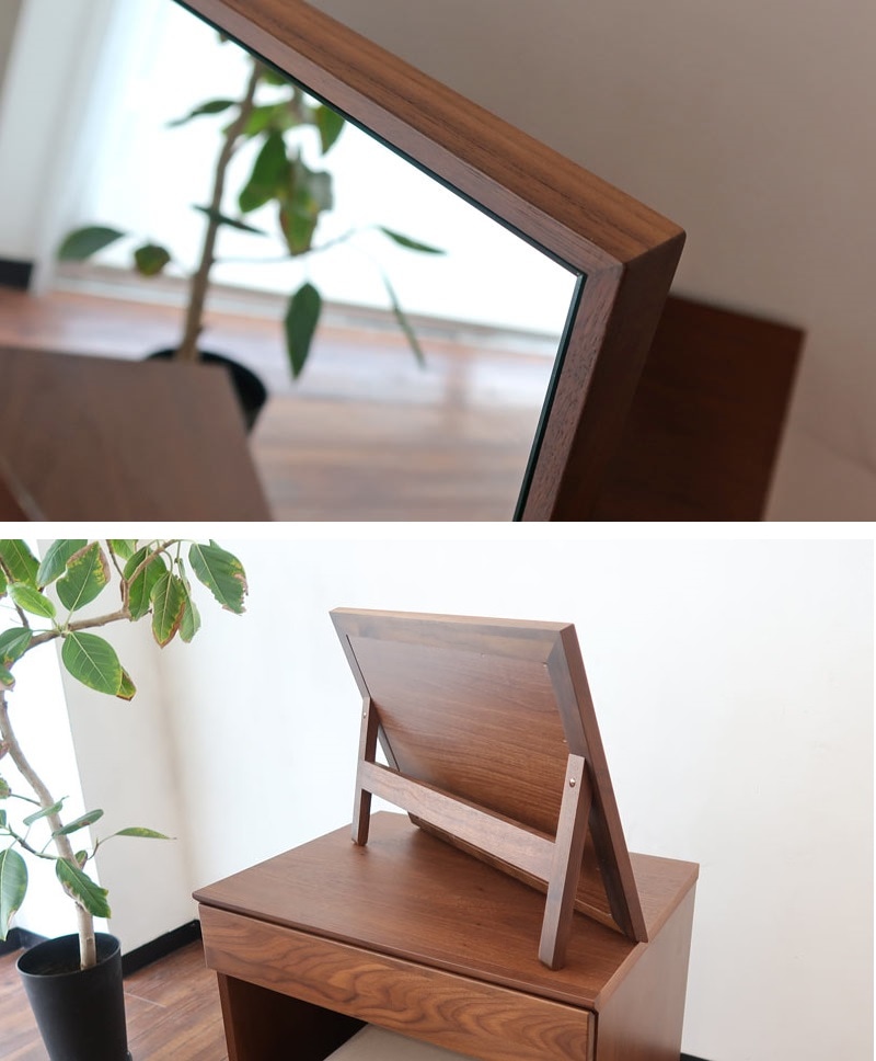 | 材質 | デスク: 天板/ウォルナット突板 引き出し前板/ウォルナット無垢材 表面材/ウォルナット突板 側板/…プリント化粧合板 スツール:ビーチ材 ミラー:ウォールナット無垢材 |