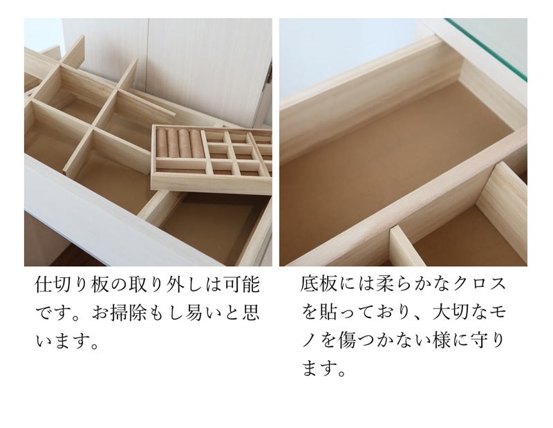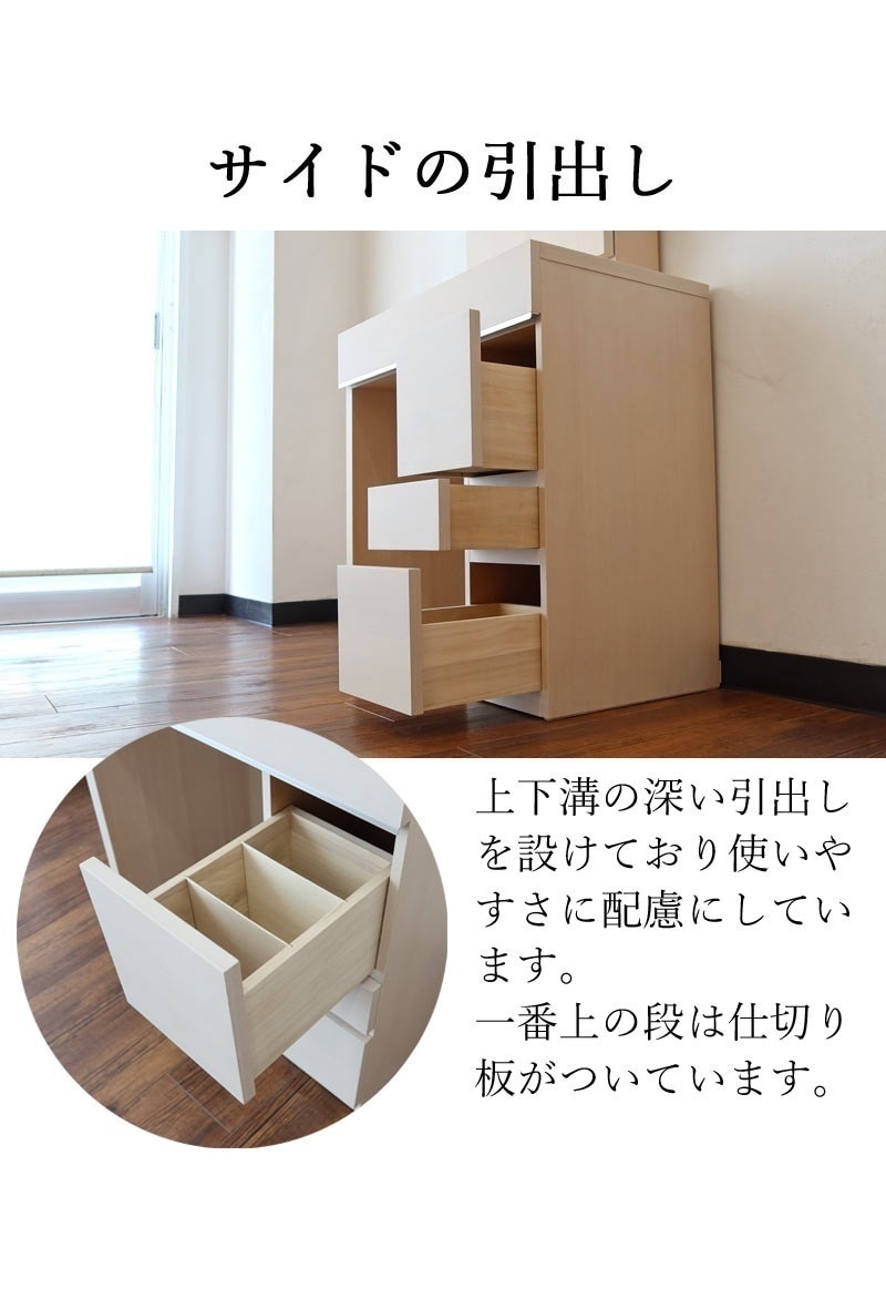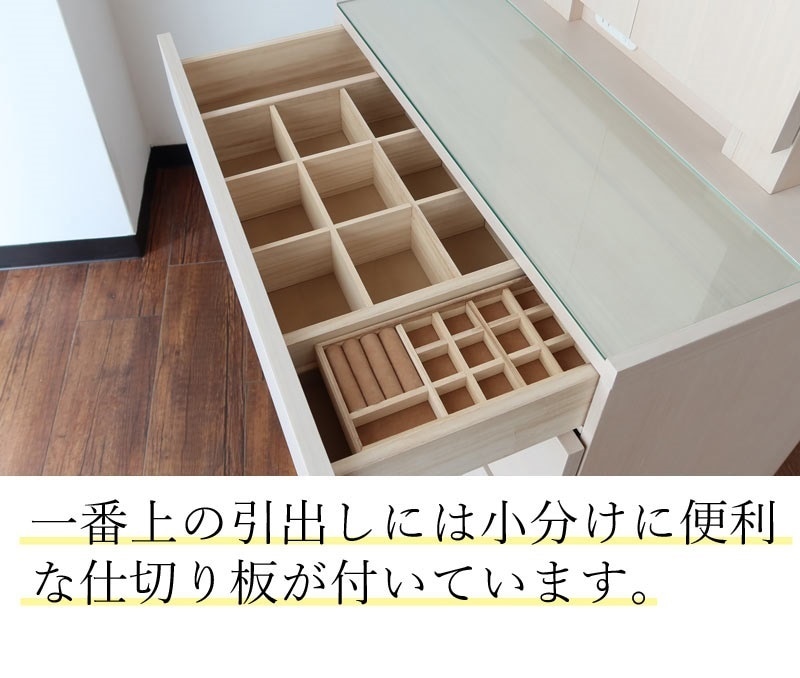 | 店長コメント | 国産の三面鏡ドレッサー(イス付き)の紹介です。 とにかく収納重視の品質の良いドレッサーをお探しの方にはオススメ! 低価格帯の商品にはない引き出しの仕切り板付き。 また、椅子の座面の下、三面鏡の扉の裏まで収納スペースがあります。 ライトは節電タイプのLEDとなっています。 (取り外し可能となっておりライトの交換も可能です。) 手間いらずの開梱設置でのお届けです。 |