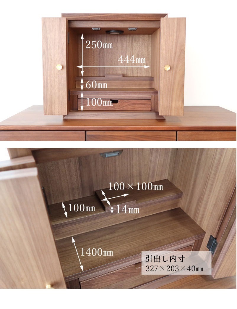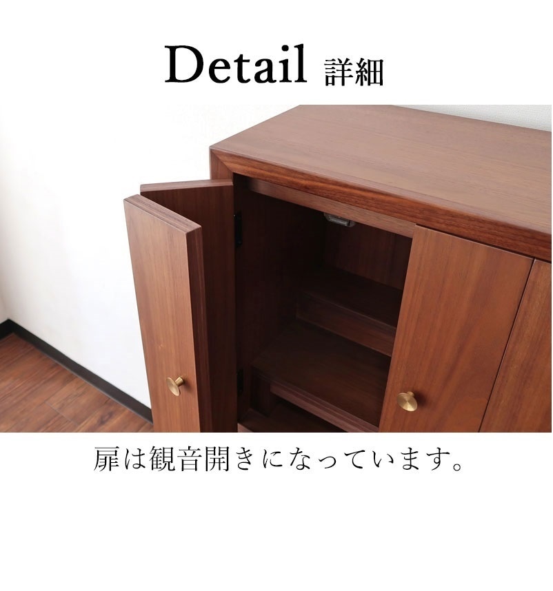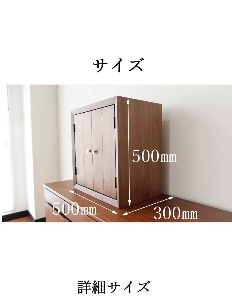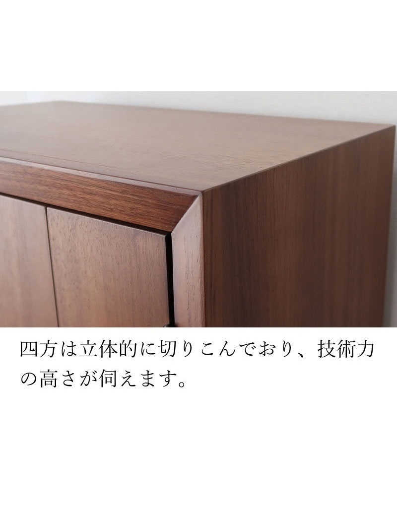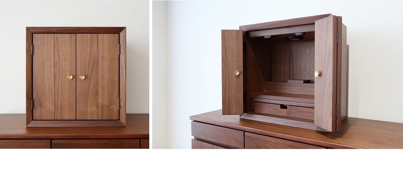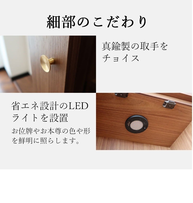 | 店長コメント | リビングなどで、共に暮らす事を考えた仏壇です。 シンプルさを追及し、扉を閉じた状態だと、それが仏壇だとは思わないデザインです。 リビングに仏壇を置きたい、でもインテリアとしては?と悩まれてる方にオススメです。 木材には世界三銘木のウォールナット材を贅沢に使用。 前板にはダイニングテーブルを製作する厚さの無垢材を使用しています。 その他、天板、側板、内装材なのはウォールナット突板材を使しています。 製作は国内老舗工場で製作されており、質の高さを感じて頂けると思います。 |