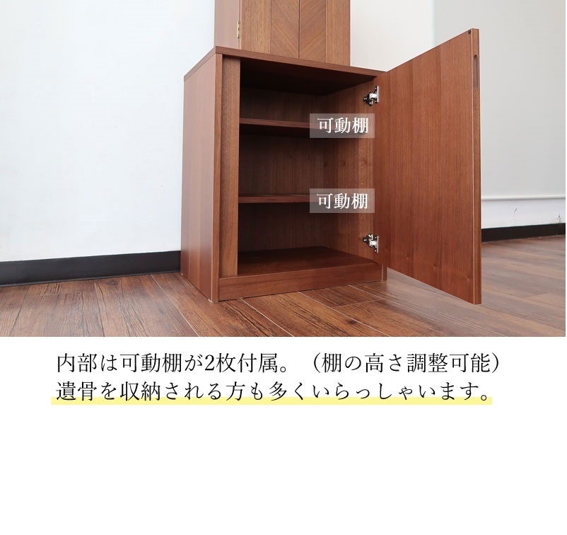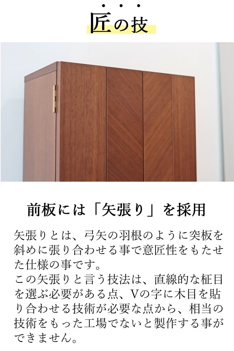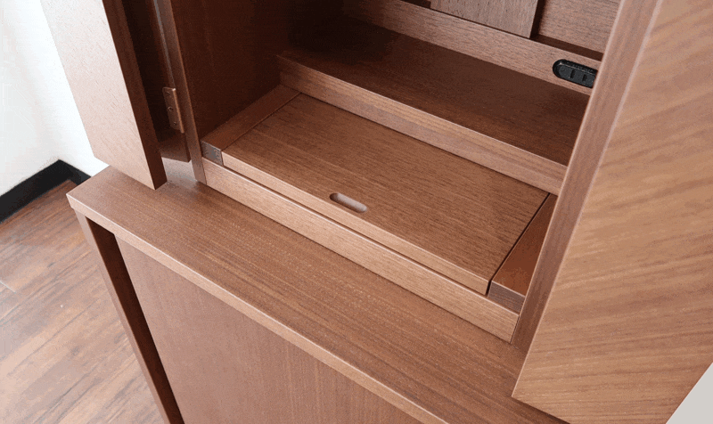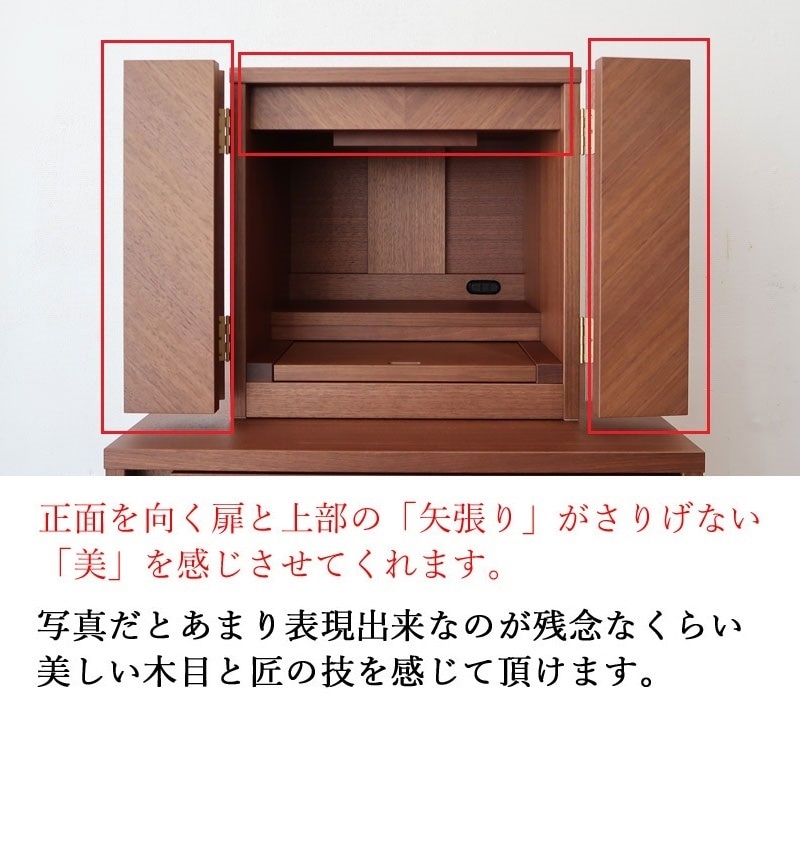 | 店長コメント | シンプルでインテリアに溶け込むコンパクト仏壇になります。 シンプルなデザインゆえ、まさかこれが仏壇だとは思わないほどです。 材質は高級木材のウォールナット材を使用しています。(ウォールナット材を使用して製作しましたが、価格は控えめなのが魅力の一つです。)製作は国内でしております。 前板には「矢張り」を採用しています。これは技術力のある工場でないと製作する事が出来ない匠の技術です。 |