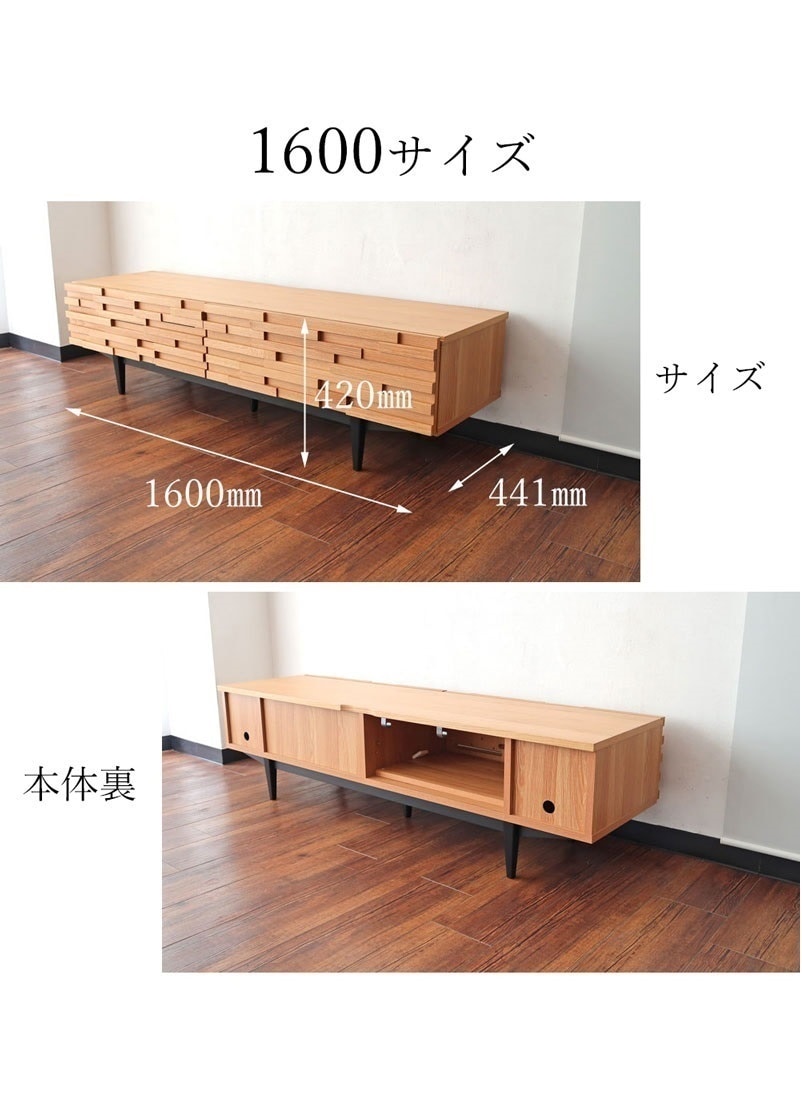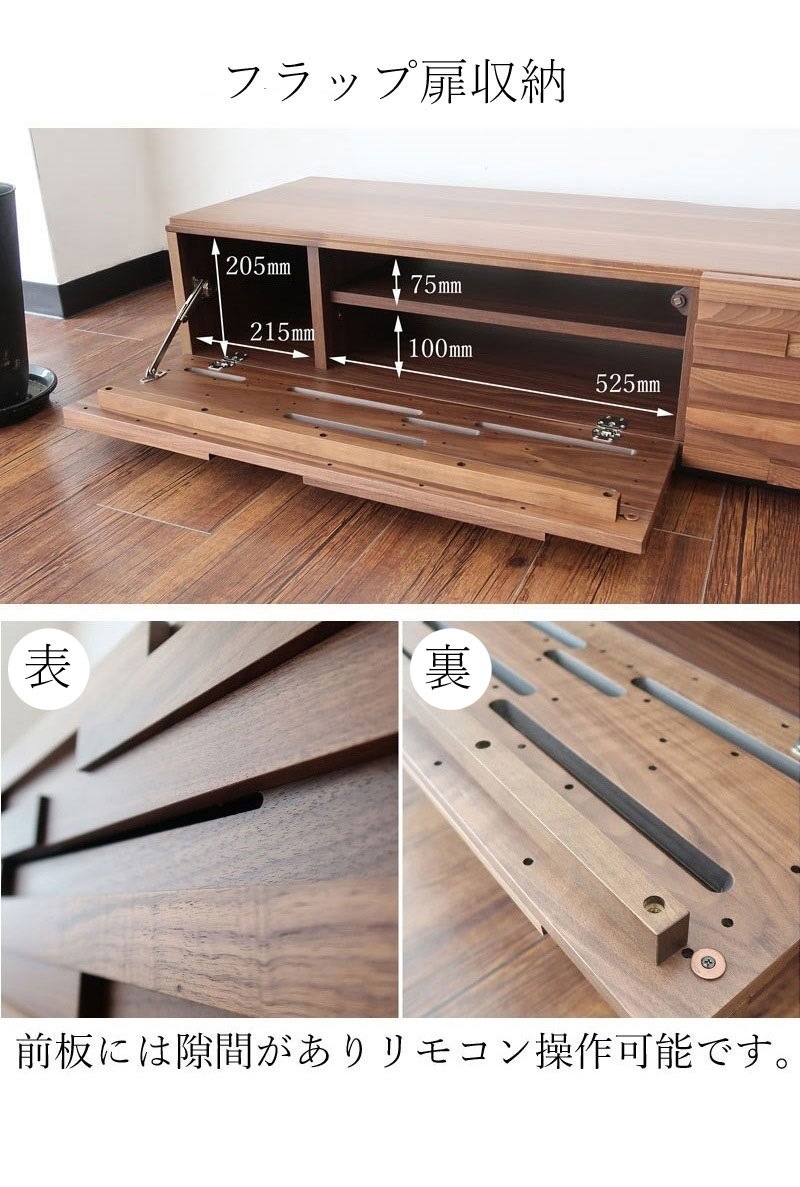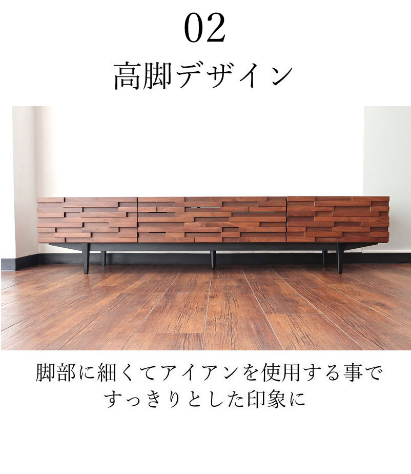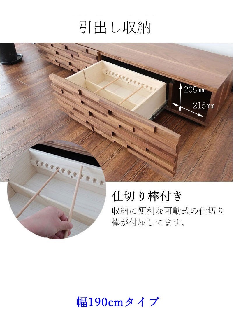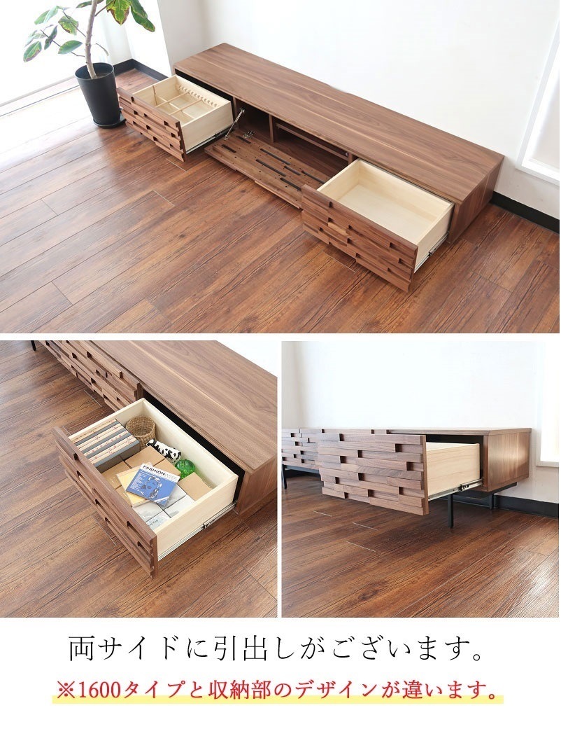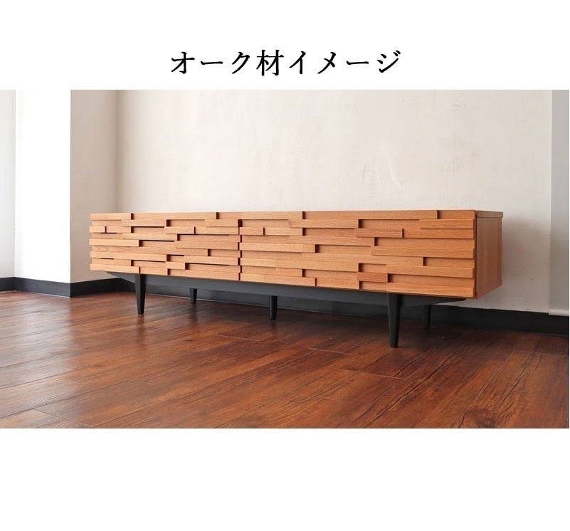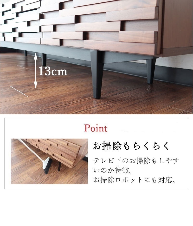 | 店長コメント | ウォールナット/オーク無垢材のウッドタイル調のデザインが魅力のテレビボードです。 テレビ台としてだけではなく、お部屋のアクセントとしてもオススメです。 少し高めの脚がお部屋をスッキリと見せてくれます。 また、テレビ台のお掃除もしやすのが特徴です。(お掃除ロボット対応) サイズ展開は2展開で幅160cmのタイプの他、幅190cmタイプもご用意しています。 ※160cmタイプと190cmタイプでは収納部分のデザインが違いますのでご注意下さい。(160cmタイプ:フラップ扉×1、引出し×1 190cmタイプ:フラップ扉×1、引出し×2)商品ページの動画は190cmタイプのものです。 |