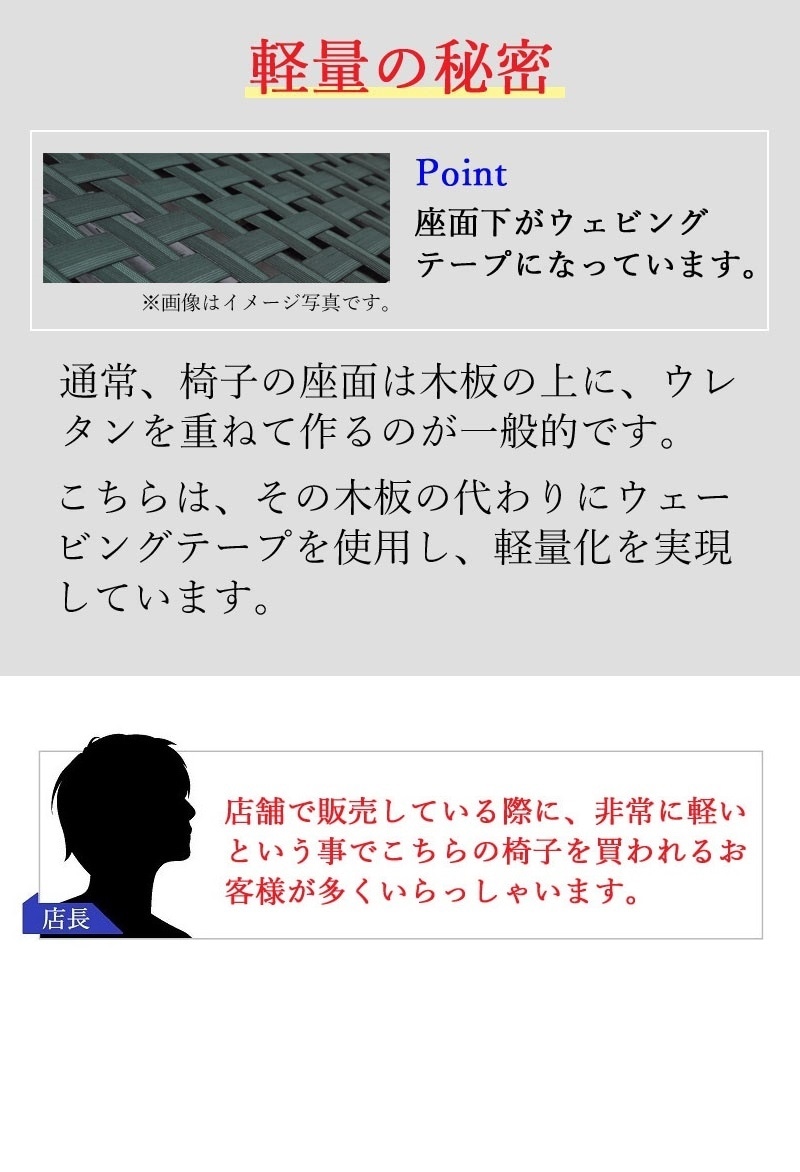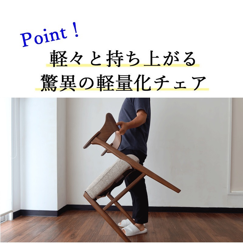 | 店長コメント | デザインだけではなく寛げる事も真剣に考えました。 「ついつい長く座ってる」そんな椅子です。 大きく形成合板で加工された背もたれは、角度や背に当たる面積の大きさを考え包み込むようにしっかりと支えてくれます。 座面は広めに設計され、程よく沈み込み安定感も抜群です。 ウォールナット材のモデルにはウォールナット他一部にバーチ材を使用しています。 |