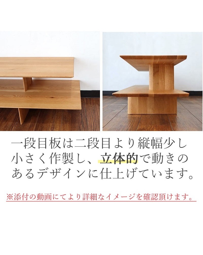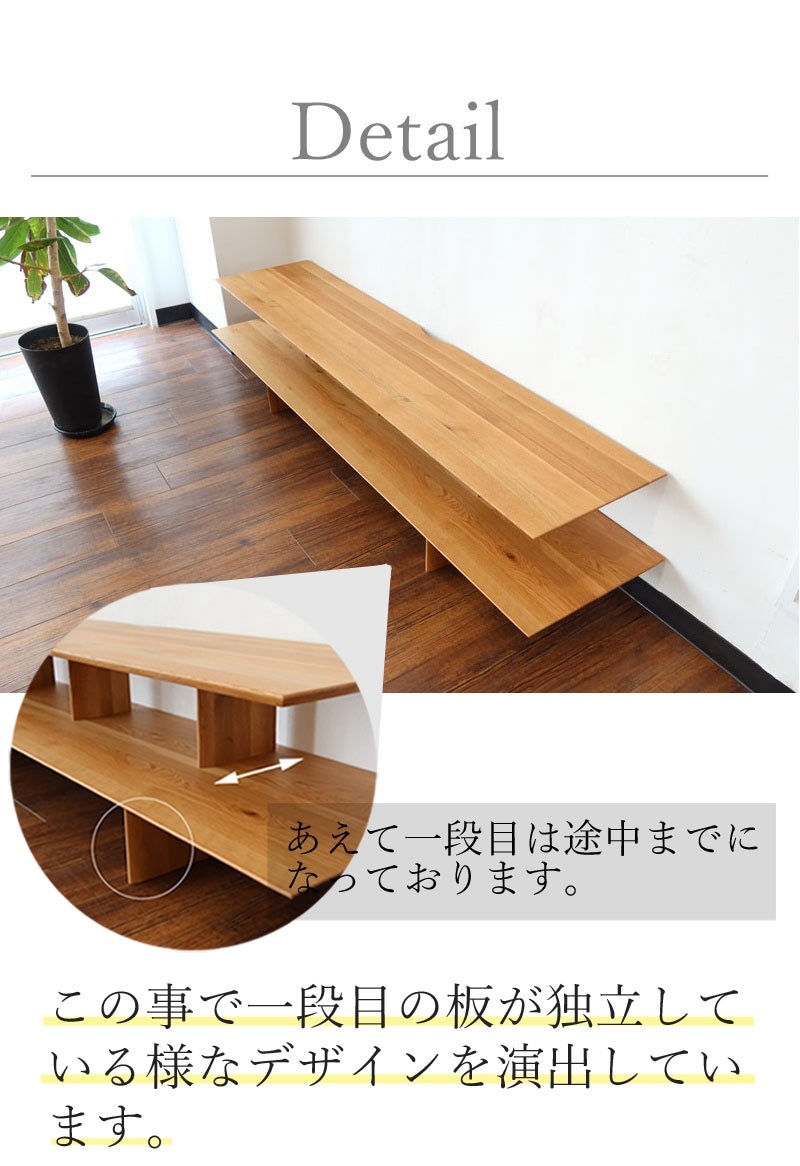 | 店長コメント | 棚で構成されたシンプルなTV台です。 贅沢にオーク無垢材を使用しています。 一段目は二段目より幅奥行共に少し小さくなっています。立体的なデザインになっています。 モダンなスタイルでも和モダンスタイルにもオススメです。 最近、配達に行くと壁から棚だけ張り出してる作り付けのTVボードを目にします。 それと似た雰囲気の商品だと思います。 ただ、違うところは壁に取り付けてないので買い替えや位置の移動が出来るところだと思います。 材質もオーク無垢材をオイルで仕上げているので高級感があり天然木のナチュラルな雰囲気を感じて頂けます。 |