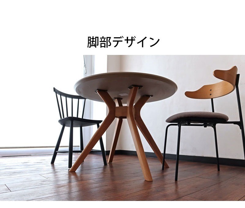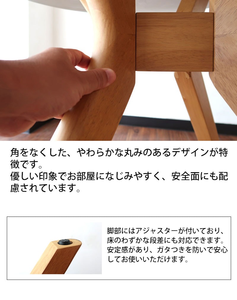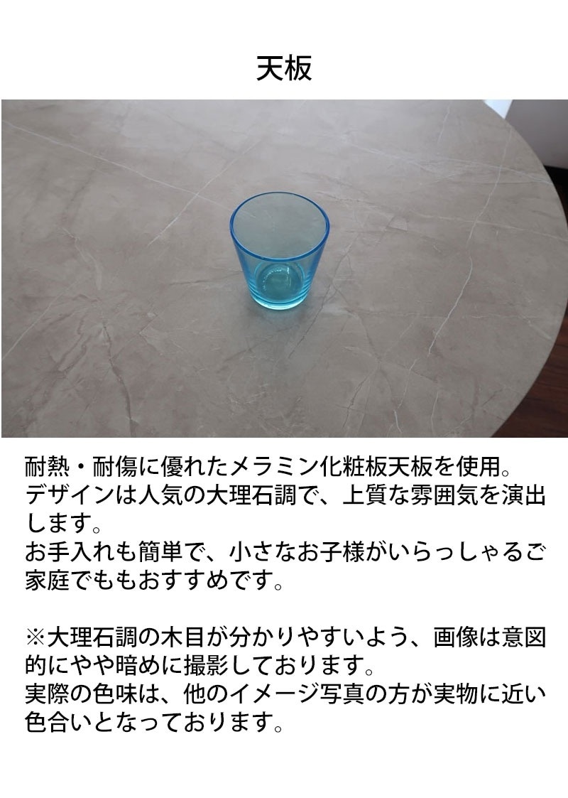 | 店長コメント | やわらかな丸型デザインが魅力のダイニングテーブル。 直径90cmのコンパクトサイズで、2~3人にちょうど良い大きさです。 天板にはメラミン化粧板を採用しており、傷や熱に強くお手入れも簡単。 大理石調の美しい柄が上品で、キッチンやダイニングを明るく高級感のある空間に演出します。 脚部には天然木ラバーウッドを使用し、木の温もりと安定感をプラス。 アジャスター付きで、床の段差にも対応します。 丸いフォルムは角がなく、安全で柔らかな印象。 ご家族との食卓やカフェ風のインテリアにもおすすめです。 |