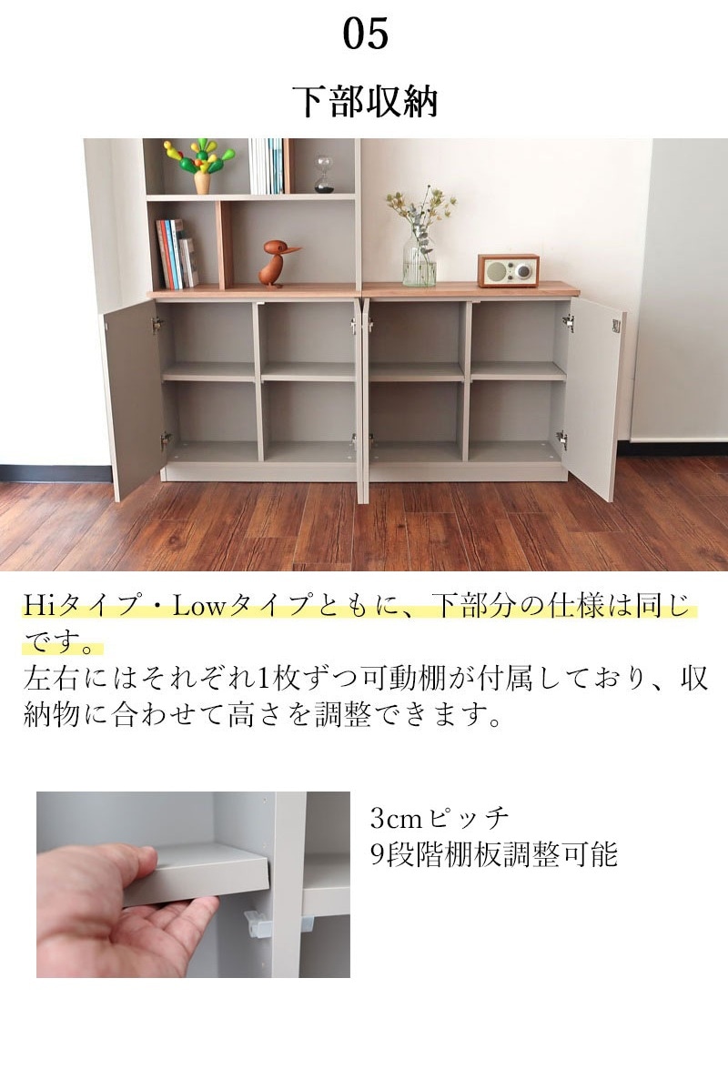 | 店長コメント | ペールトーンのグレーカラーが新鮮でおしゃれな印象を与えます。 アクセントとして木目カラーを採用し、シンプルながらも温かみのあるデザインに仕上げました。 書斎やオフィスはもちろん、リビングにもおすすめ。 特にHIタイプは書類や雑誌の収納だけでなく、お気に入りの小物やインテリアをディスプレイするスペースとしても活用できます。 商品は完成品でのお届けとなり、開梱設置サービス付きですので、届いたその日から安心してお使いいただけます。 |