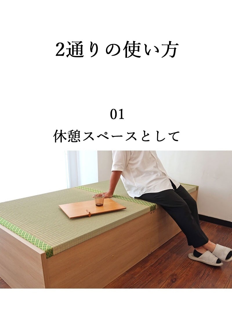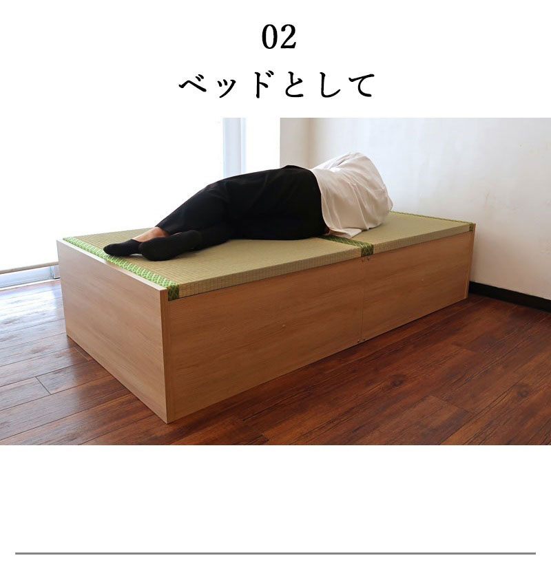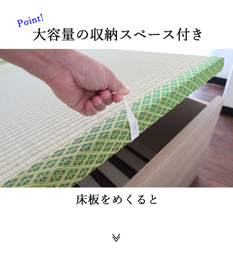 天板は全面フラット仕様で、布団を敷いてもすっきり。 ベッド下はたっぷり収納スペースを確保しており、季節物の寝具や日用品の整理に便利です。 ・快適性と機能性 床面には通気性に優れたすのこ構造を採用。湿気を逃し、寝具を清潔に保ちます。 立ち座りがスムーズに行える高さ設計で、毎日の動作も快適です。 ・自然素材の心地よさ 天然イ草の効果で、リラックス効果・調湿機能・空気清浄作用が期待できます。 和の風合いを楽しみながら、心地よい睡眠環境を整えます。 ・安心の品質 耐荷重:最大120kg ・国産製品 F☆☆☆☆(フォースター)低ホルマリン仕様で安心・安全 > |