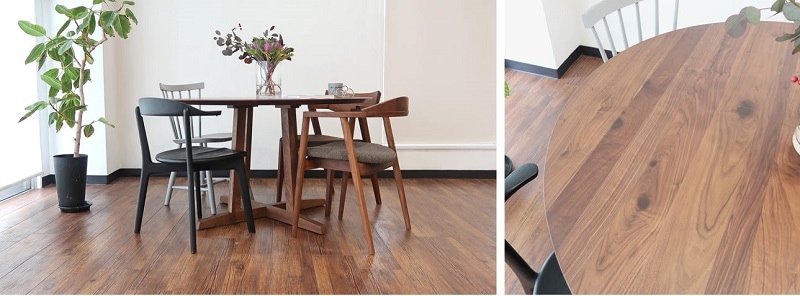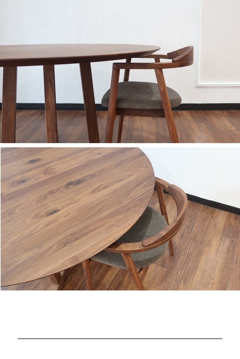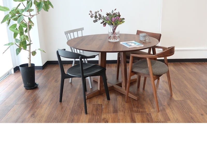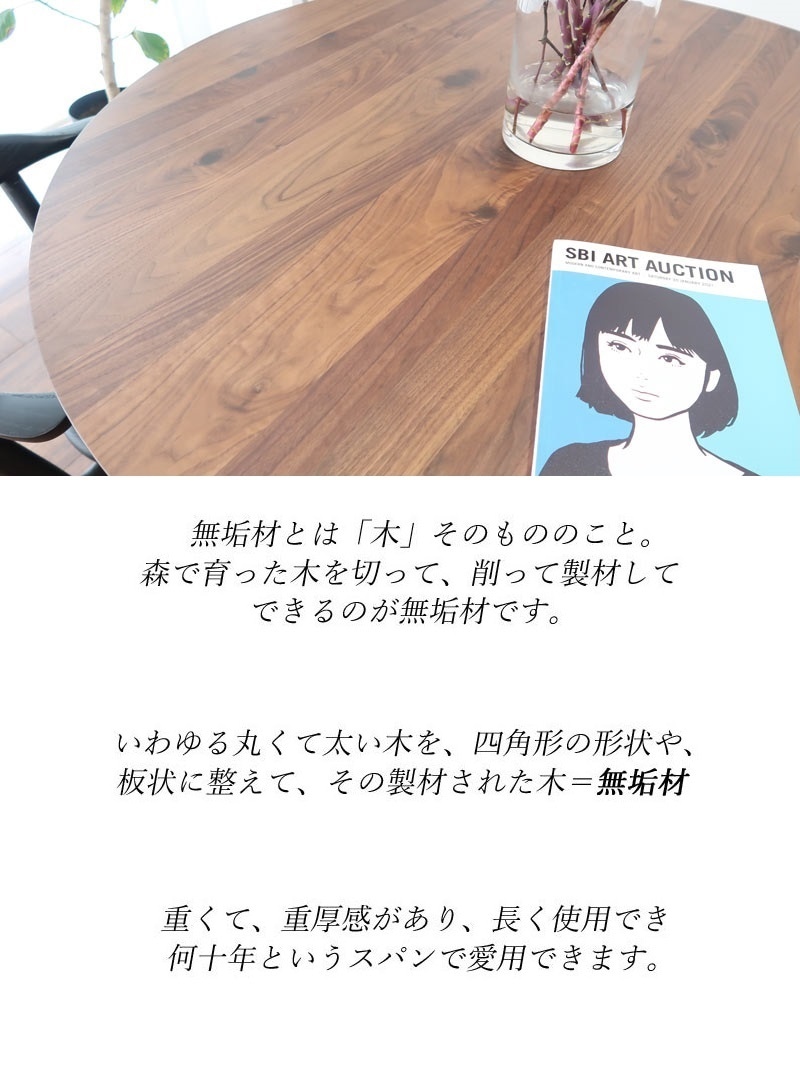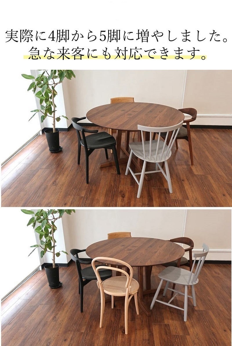 | 店長コメント | 上質なウォールナット無垢材を使用した、直径120cmの円形ダイニングテーブルです。 天板には深みのある木目が美しいウォールナット無垢材を贅沢に使用。 天然木ならではのあたたかみや質感を存分に感じていただけます。 表面はウレタン塗装仕上げのため、水や汚れに強く、小さなお子さまがいらっしゃるご家庭でも安心してお使いいただけます。 脚は中央に配置されたセンターベースタイプ。 脚まわりが広く使えるため、座る人数を柔軟に増やせるのが特徴です。 来客時やご家族の集まり(お正月・お盆など)にも便利で、快適にお食事を楽しめます。 お届けは開梱設置サービス付き。 届いたその日から、面倒な組み立て作業なしでお使いいただけます。 |